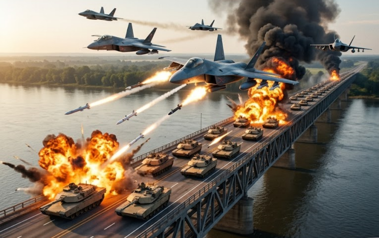 Witness accounts from near the scene describe the sky darkening with tracer fire as Russian jets unleashed a coordinated barrage of precision‑guided munitions. Sources close to the action claim that the surprise strike came without any prior warning, catching the U.S. armored column in the middle of its transit along the narrow bridge span. In seconds, what had been hundreds of cutting‑edge M1 Abrams main battle tanks and other armored vehicles were transformed into smoldering hulks, rendering the bridge itself a tangled mass of scorched steel and shattered concrete.