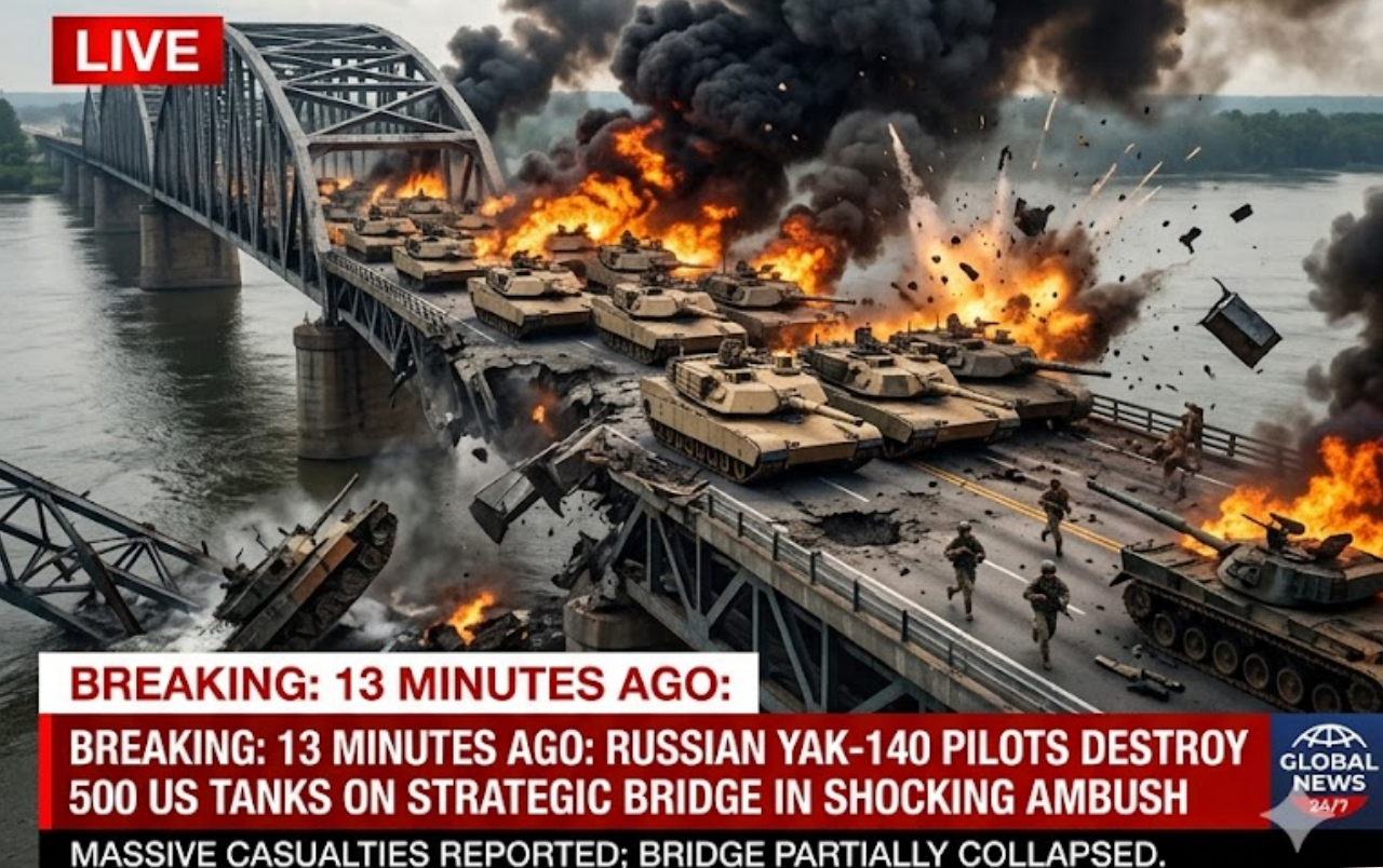 In a stunning and unprecedented escalation on the global military stage, reports emerging in the past quarter‑hour claim that Russian air crews flying Yak‑140 fighter‑attack jets executed a devastating ambush against a massive U.S. armored column, annihilating 500 American tanks on a key strategic bridge deep inside contested territory.