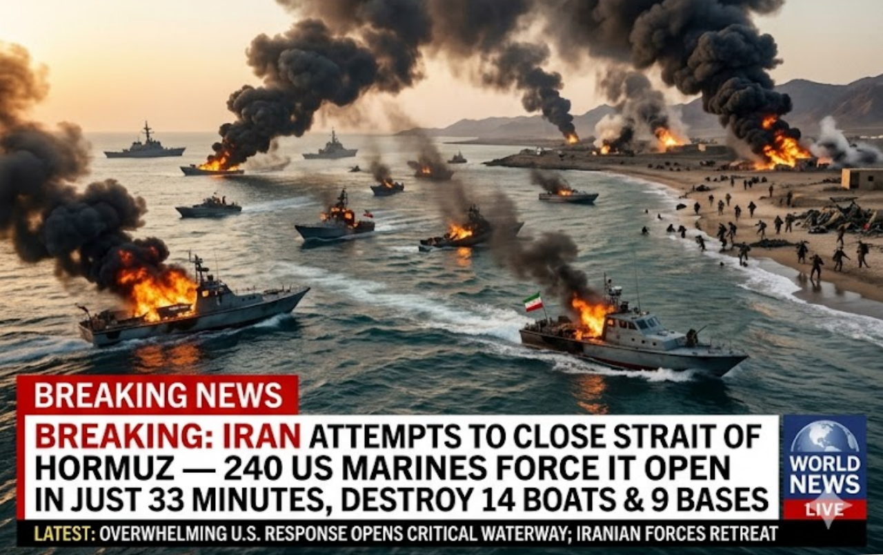 According to this scenario, a contingent of 240 U.S. Marines was quickly mobilized to counter Iranian efforts and reopen the Strait of Hormuz. This force, supported by U.S. naval firepower and aerial assets, is described as engaging multiple maritime threats attributed to Iranian forces — ranging from fast attack craft and mine‑laying boats to fortified positions along the shoreline purportedly used to threaten shipping. Over a 33‑minute operation, they reportedly neutralized numerous hostile vessels and shore installations — with claims of 14 boats destroyed and 9 coastal bases struck — before effectively restoring a safe corridor for allied and commercial traffic.
