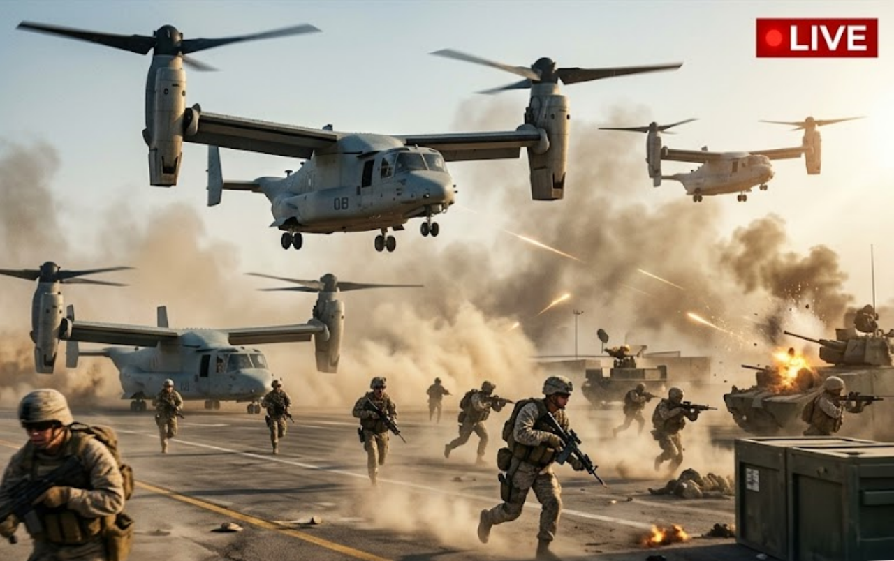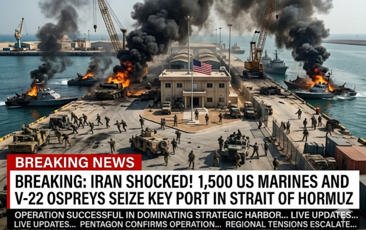 In a dramatic escalation of the Strait of Hormuz crisis, U.S. forces have reportedly executed a precision amphibious assault involving roughly 1,500 U.S. Marines inserted by V‑22 Osprey tilt‑rotor aircraft to seize control of a strategic port on the strait’s northern coast. The operation — billed by U.S. commanders as essential to forcing open one of the world’s most critical maritime chokepoints — has sent shockwaves throughout Tehran, Gulf capitals, and global energy markets.