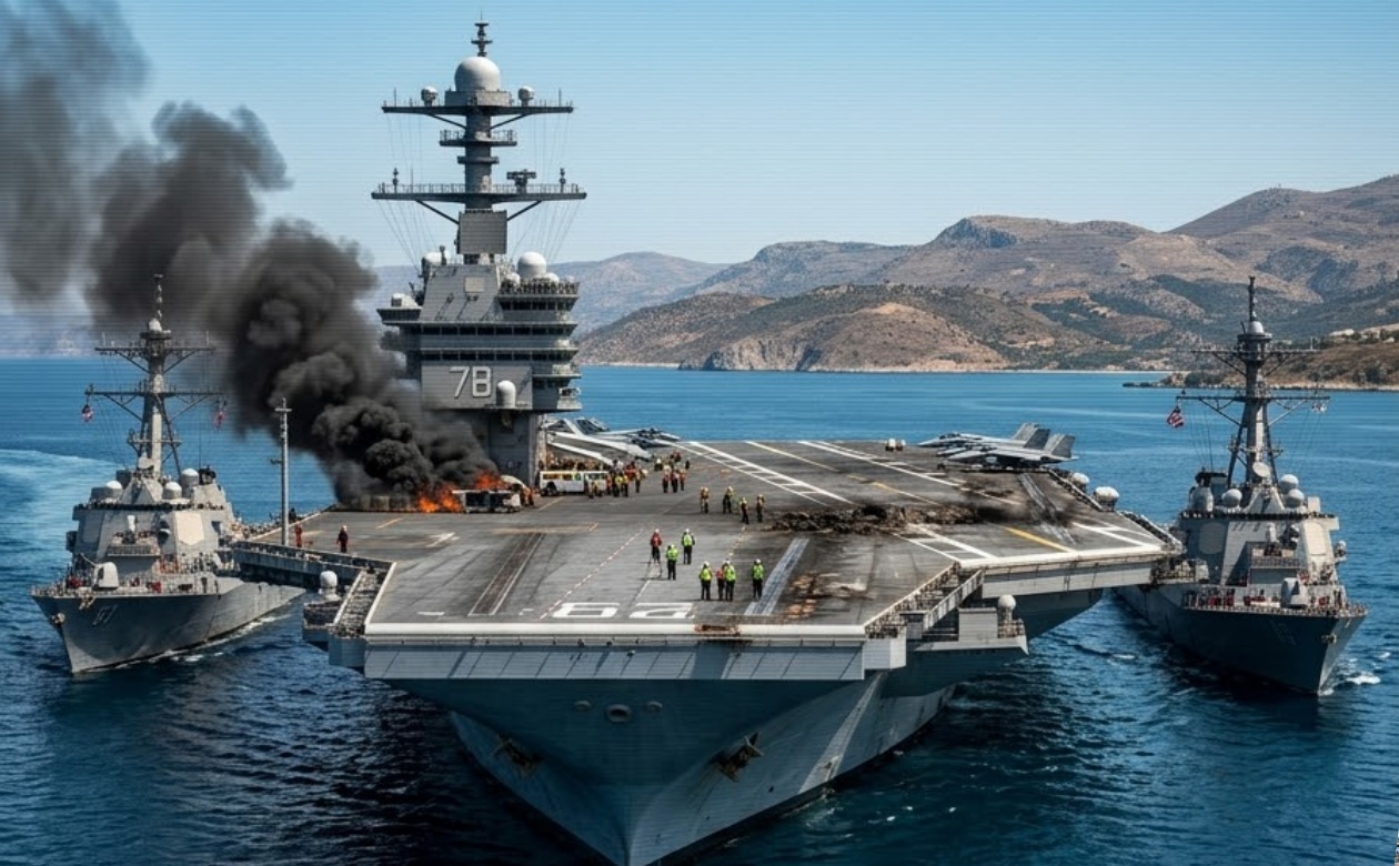 A striking indication of pressure on U.S. naval strength has emerged as the USS Gerald R. Ford—widely regarded as the most advanced and costly aircraft carrier ever built—has arrived at Souda Bay in Crete for urgent repairs. This unexpected stop has taken the vessel out of active duty during a critical phase of tensions involving Iran. Although the U.S. Navy describes the situation as routine maintenance following a reported fire in a laundry area, many observers suspect that the official explanation may not tell the full story.